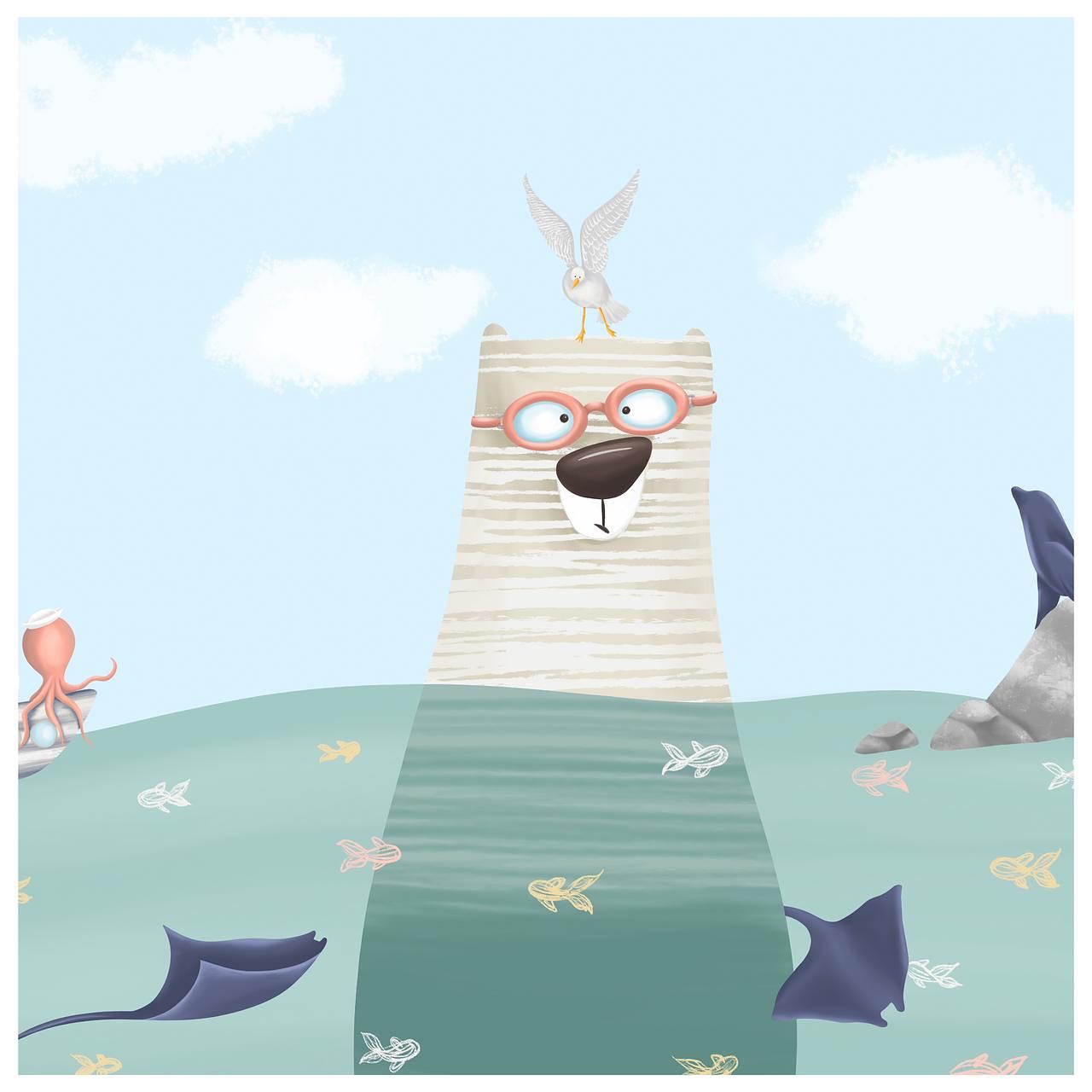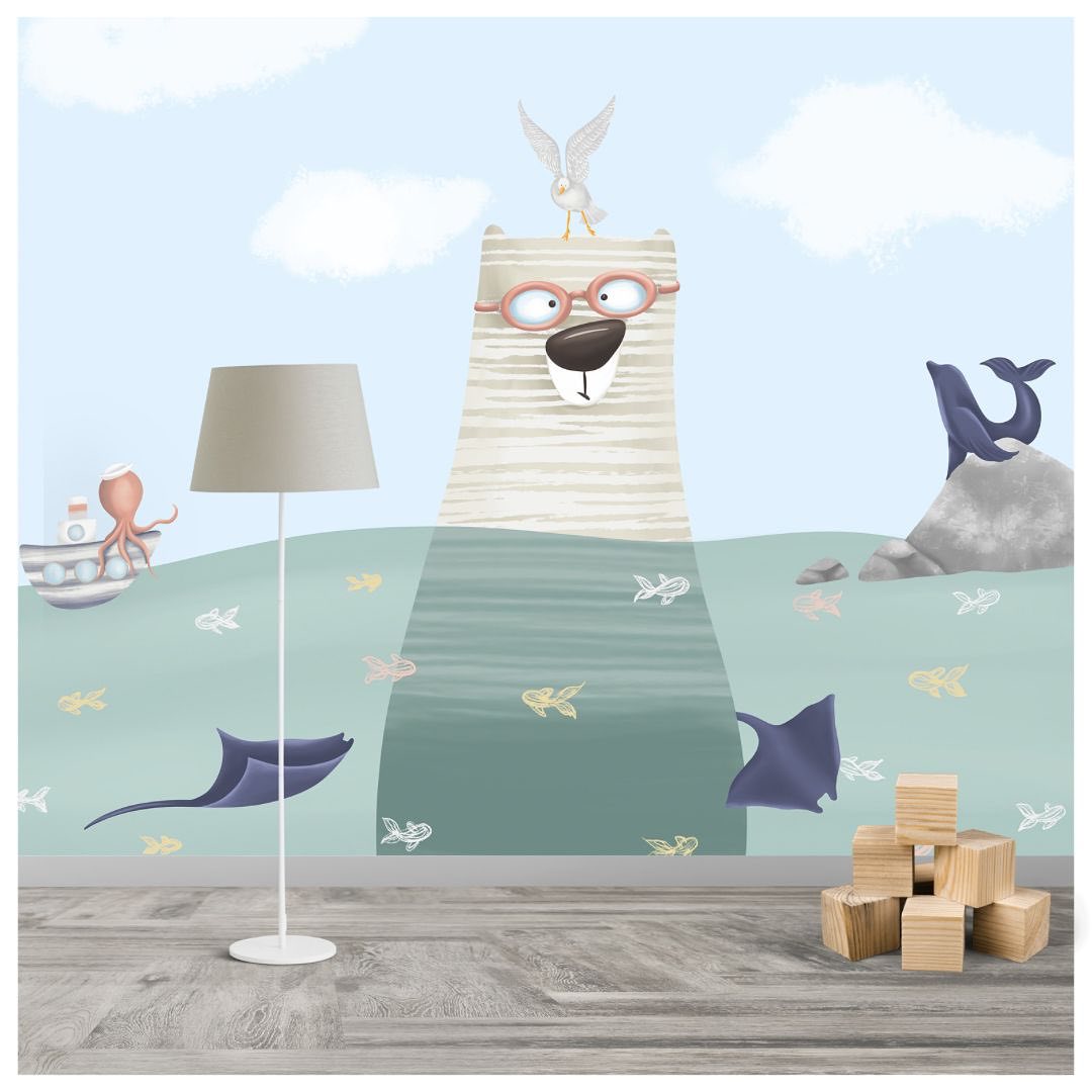 This playful wallpaper design brings a whimsical underwater adventure to life, featuring an adorable bear donning glasses, surrounded by curious sea creatures like octopuses, whales, and seagulls. Designed to evoke wonder and spark imagination, it creates a soothing and magical atmosphere in your child’s room.