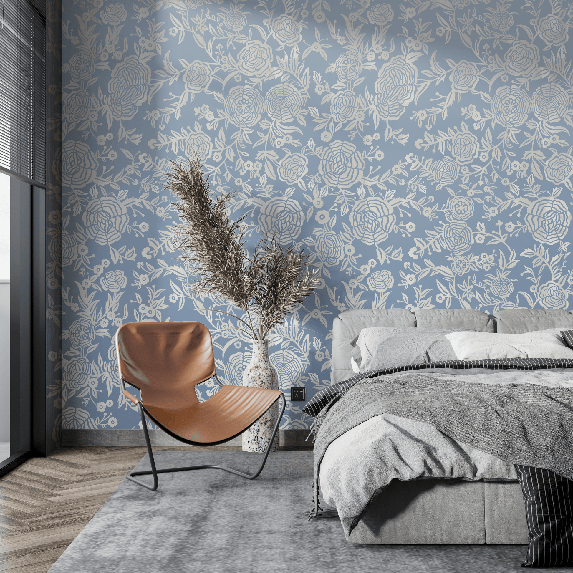 On a powder-blue base, delicate white vines and floral outlines weave across the surface, offering a quietly elegant companion to understated interiors.
