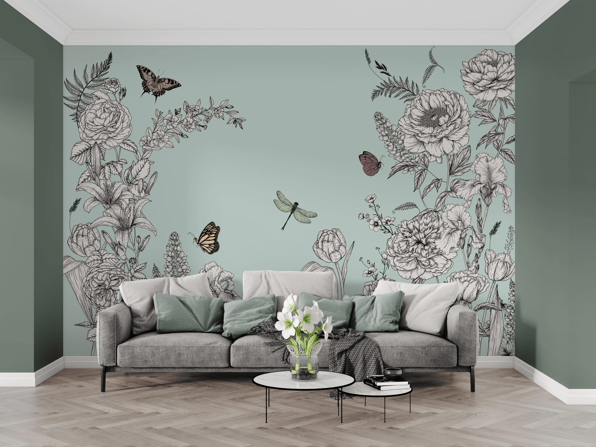 Pastel Bloom is a delicate interplay of soft greens, charcoal-outlined botanicals and fluttering butterflies rendered in a serene, soothing palette that refreshes a space without overwhelming it.
