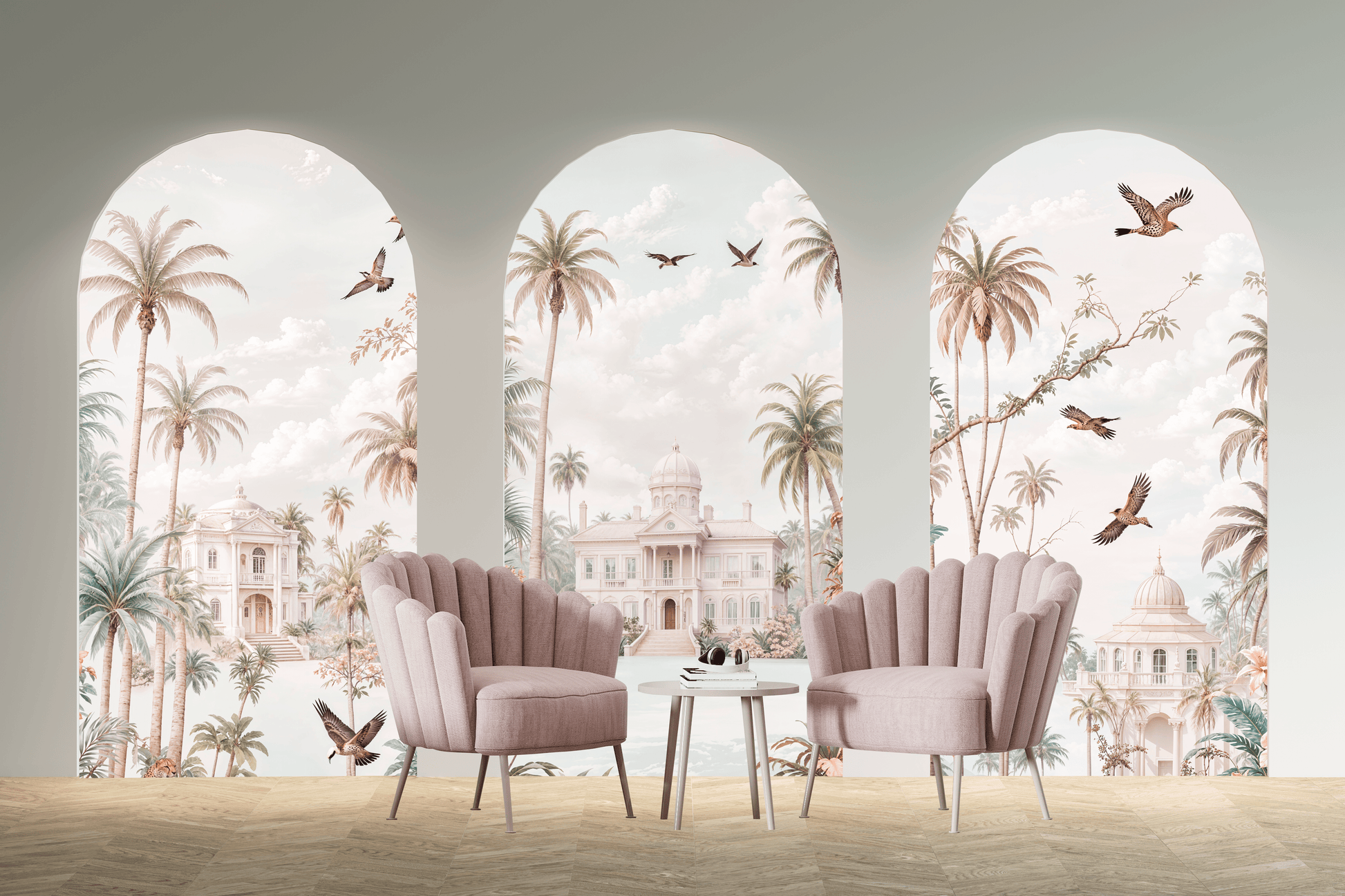 Framed by soft arches and serene skies, the design invites a graceful flow of space and breath into your interior.